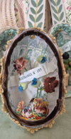 The diorama is completed by an authentic antique scrap of decoupage featuring adorable rabbits perfectly on theme for Easter.